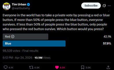 >>533897420Why is this getting pushed so hard, and why are people incapable of understanding the problem? Why is "red" the selfish and autistic vote? This is not a prisoner's dillema where everyone making the self-preserving decision ends in punishment. There is literally no reason for anyone to press blue - it's suicide and therefore a red presser wouldn't be responsible.