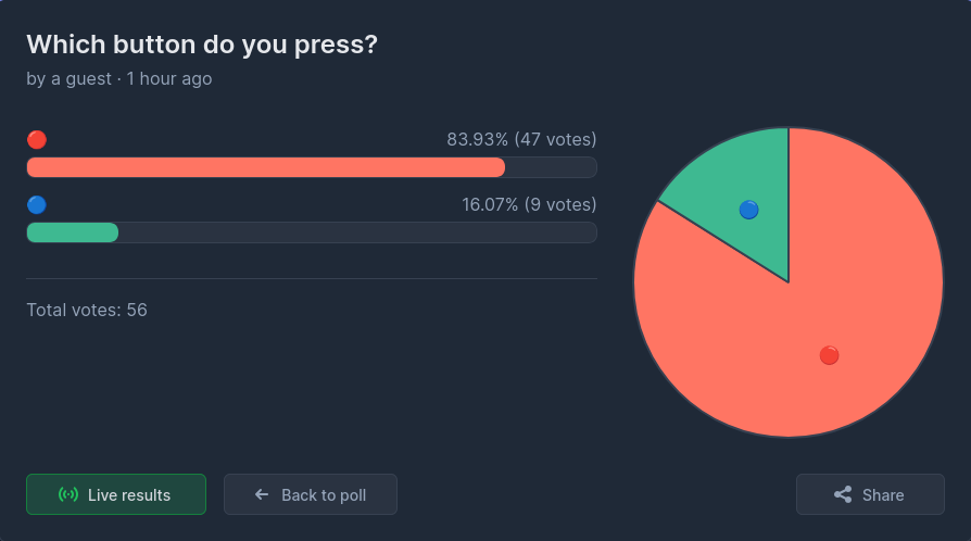 >>533897420I press red and is happy and content about it.https://strawpoll.com/XOgOV0W8Gn3
