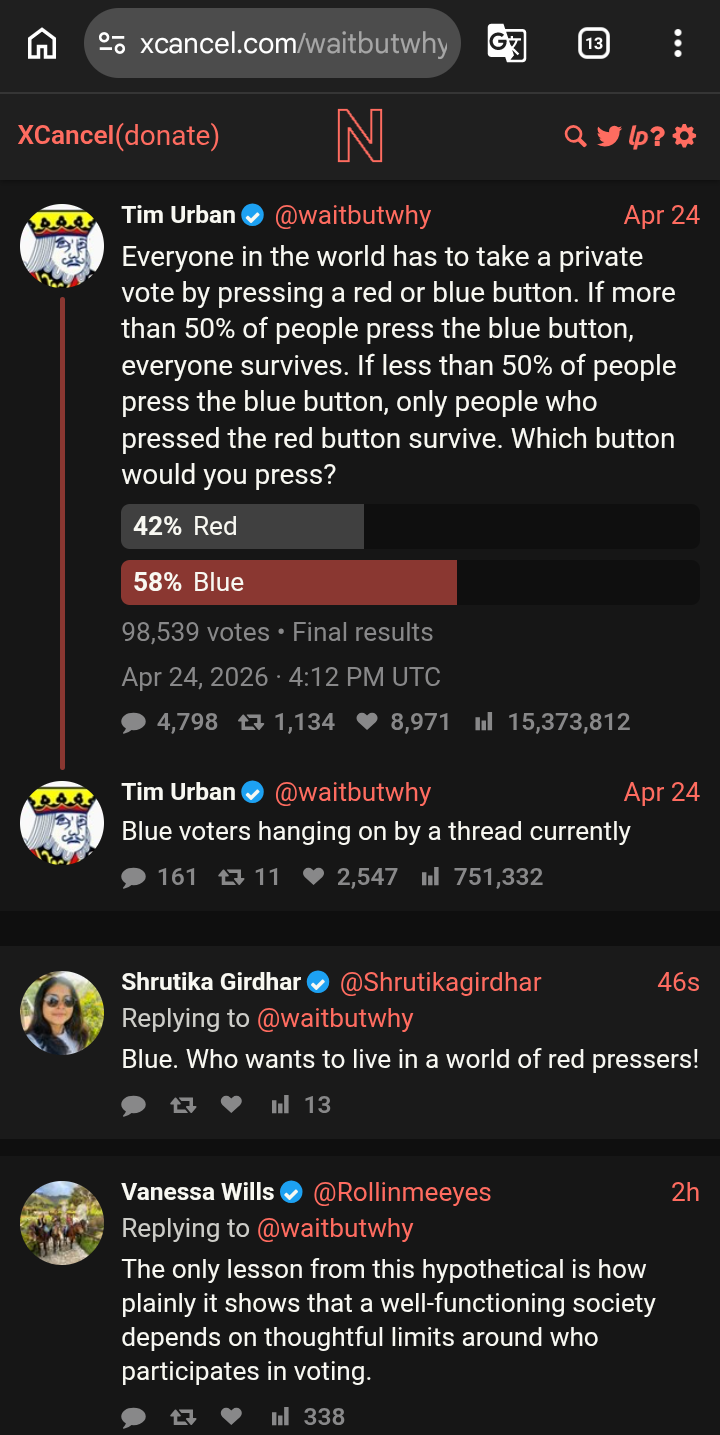 >>533897855Red. Unvaxxed.Wife is blue, unvaxxed. She's unvaxxed because I convinced her not to get it even when everyone around her was getting it, and she swapped her vote to red once I explained the game theory of the button question to her.The ONLY way I'd ever press the blue button is if my family had to choose before I could, and they chose the blue button. In that ONE scenario, I would press the blue button. Assuming the global population has some period of time to discuss the outcome of the button press though, you'd have to be insane to go with the blue button.