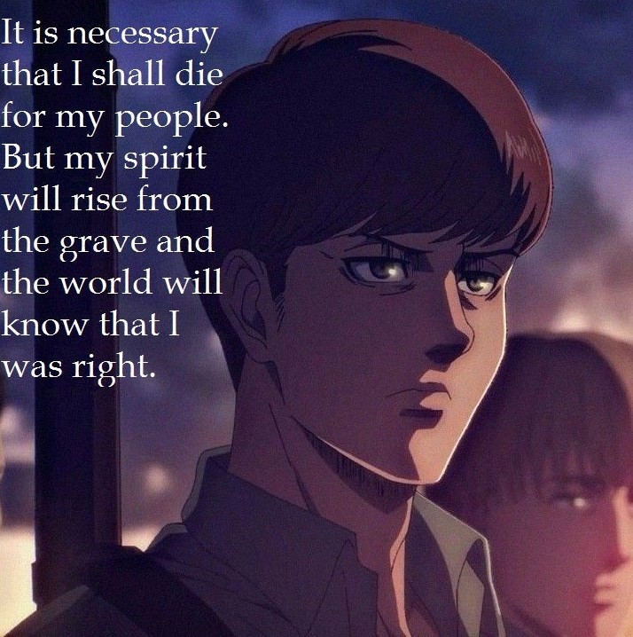 >>533915497Attack on Titan leaves a lot open to interpretation. There is indeed the commonly held normie view that Eren is a warning of how even righteous anger unchecked leads to destruction and fascism, and that at best all it does is perpetuate the cycle of violence.But there is a red pilled view that Eren was the hero of the story. He valued his people over the world, and wouldn't entertain the argument that his people had to die out just because they were less in number. Eren always had a martyr complex, and he chose to channel it into being the scapegoat for his people. He did what had to be done to save his people, and because he acted alone and died in the end, they were spared the weight of his actions, while reaping the benefits. Additionally, he bought them an extra 100 years of prosperity. It wasn't a permanent victory but it was a meaningful one.