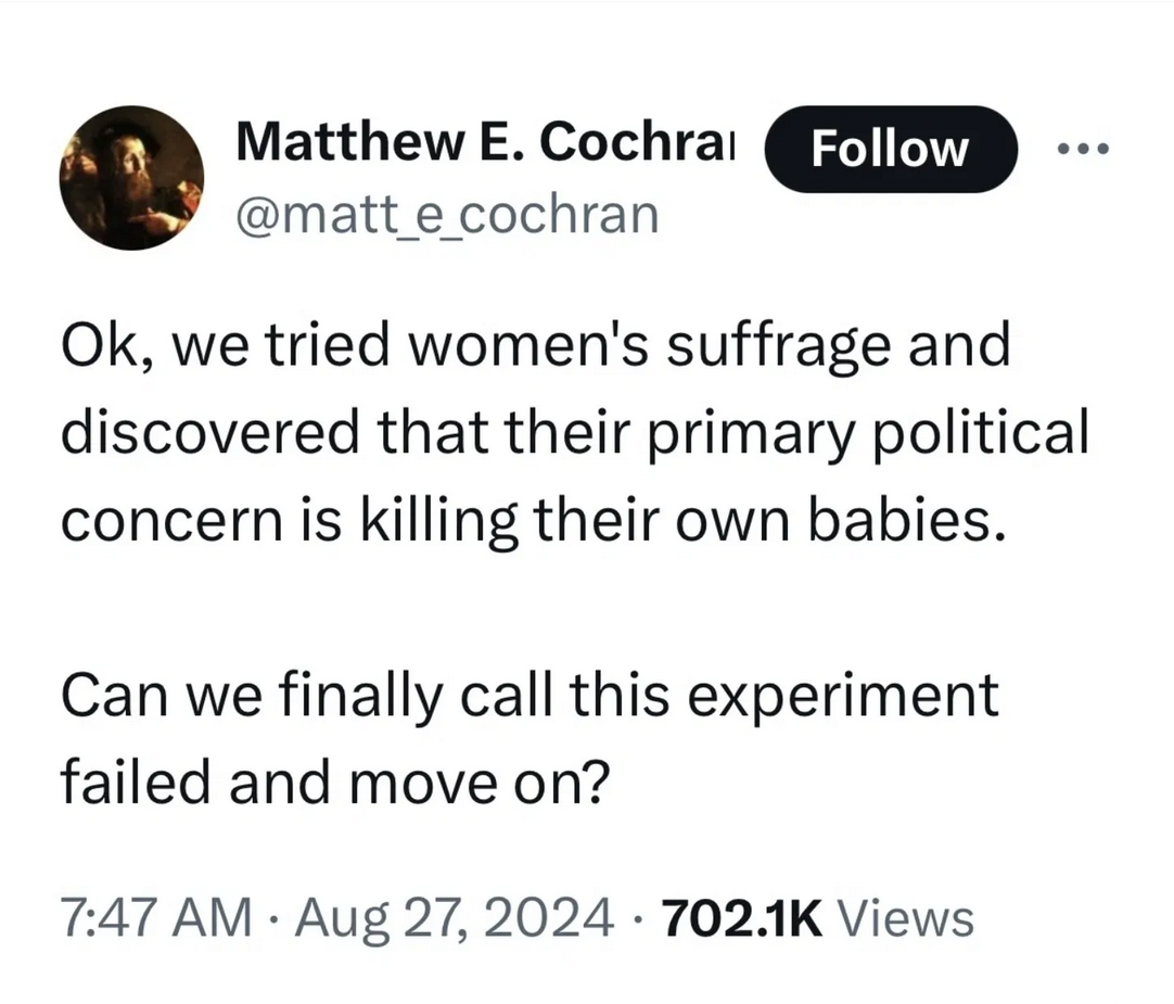 >>533903389It’s a weak man problem, everything women have was given to them by weak men, they permit it, they reward it and nature’s punishment is the eradication of their genes and replacement by men who don’t allow it