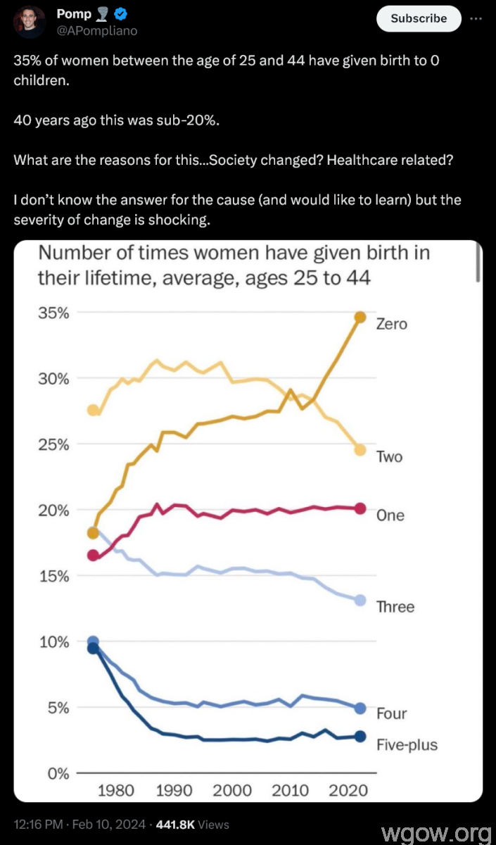 >>533907562This. Feminism started over 100 years ago in countries like the USA and USSR when women got the right to vote, get educated, and work. What happened after that was there was a massive baby boom, after WW2. I mean there is literally a generation called the Baby Boomers because of how many babies were born in post-WW2 feminist society. Feminism has nothing to do with it. Birth rates boomed in past feminist societies and birth rates collapsed in modern non-feminist, masculine-valued societies.I would put more of the blame on personal pocket computers and internet replacing people's IRL interactions with digital interactions. Before people were forced to interact in person. Now people get addicted to computers and can substitute real life social life with parasocial relationships and online interactions. It's going to get worse when more people start using AI as substitutes for human relations still.