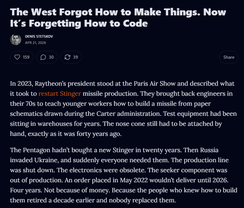 WTF is wrong with the West?https://techtrenches.dev/p/the-west-forgot-how-to-make-things