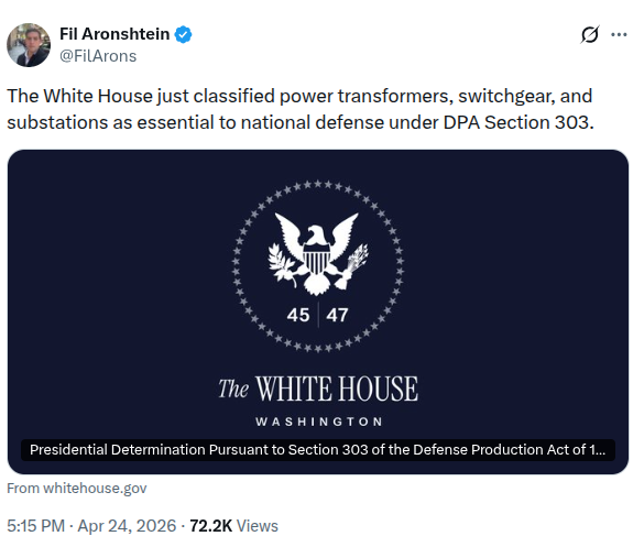 >>533917024>power transformers, switchgear, substrations essential to national defense.They weren't considered critical infrastructure before?And what about (say) sewage plants?Take those out and I give two more weeks (yes, two more weeks) before disease and cholera begin to set in.