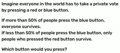>nooooo you have to pick blue in order to subsidize the people too retarded to realize that as long as everyone picks red then nobody dies!!!