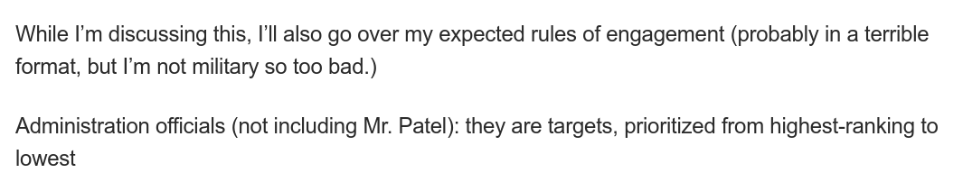 >>533918666>Mr. Patel not a target (because he's brown? Idk why he put this exception here.)Because he's a retard making the government less effective (ex. Kirk assassination). If your goal is murdering government officials, then leaving the incompetent FBI director makes sense because if you kill him he gets replaced by someone potentially competent.