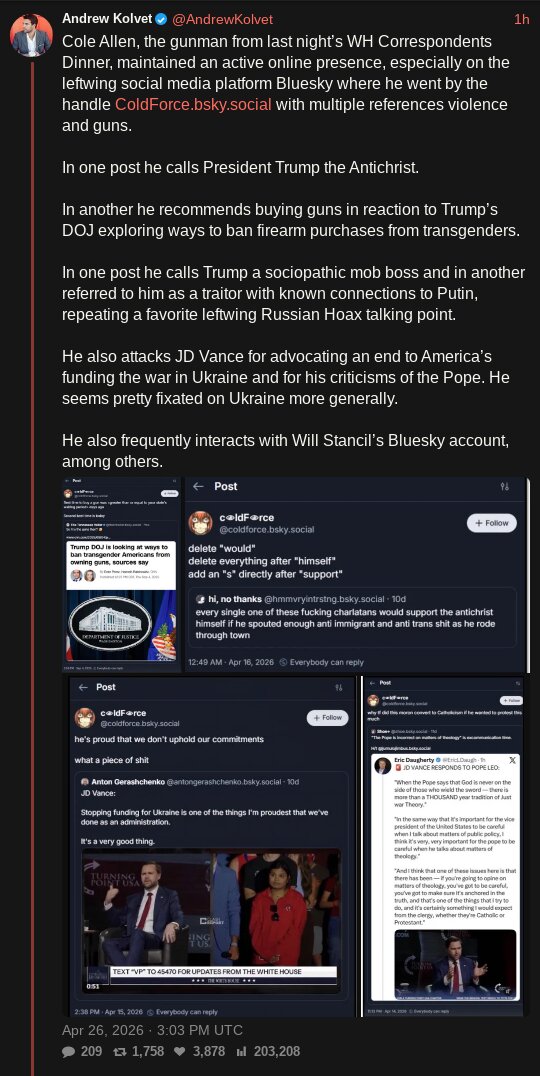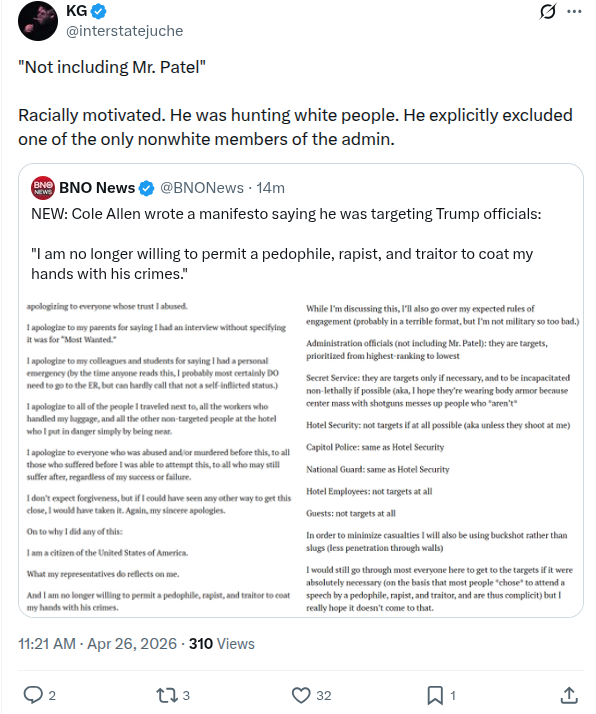 >>533917437yeah here>https://nypost.com/2026/04/26/us-news/read-whcd-gunman-cole-allens-full-anti-trump-manifesto/totally mindraped by trump lmfao