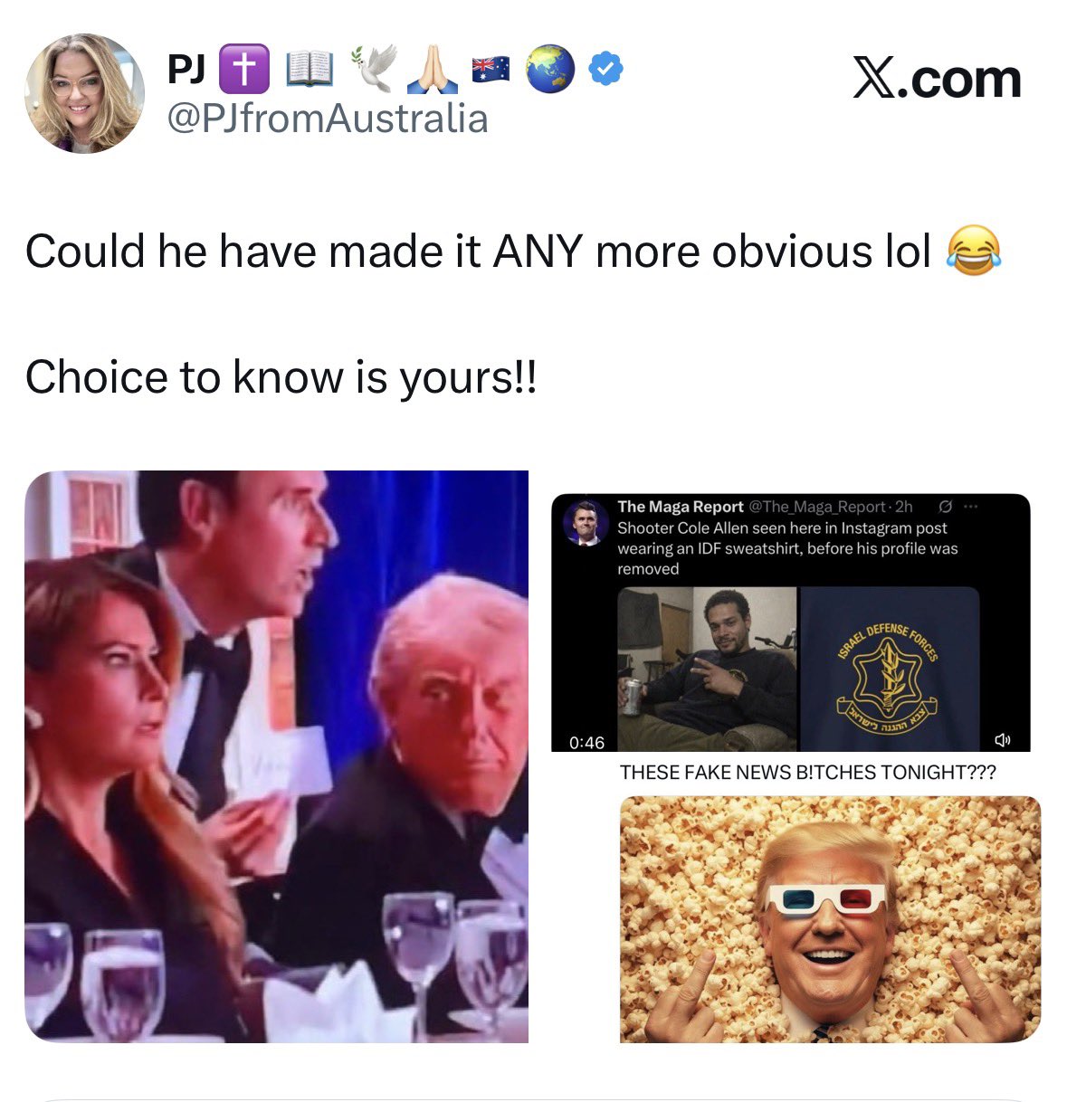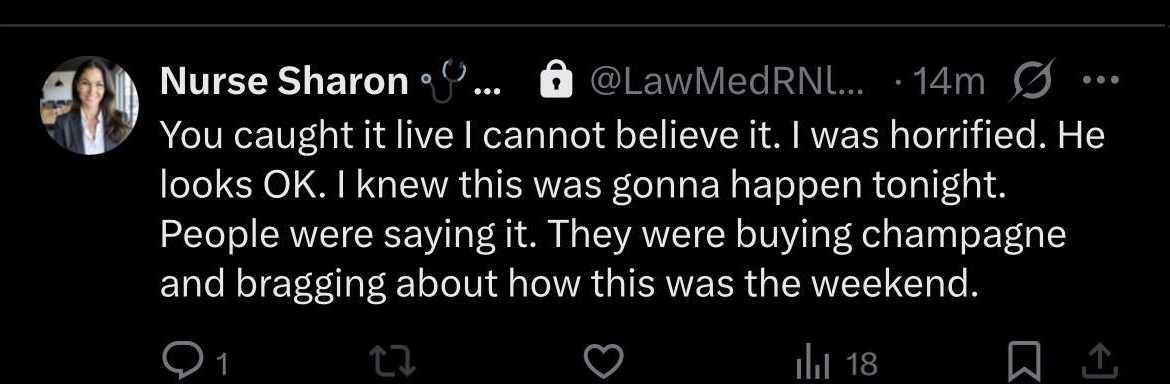 It's interesting how there are some being said people in the dinner knew and bragged about it with eachother of what was comingVance is rushed out first before trump as well, i think they wanted to kill trump and have vance take over.