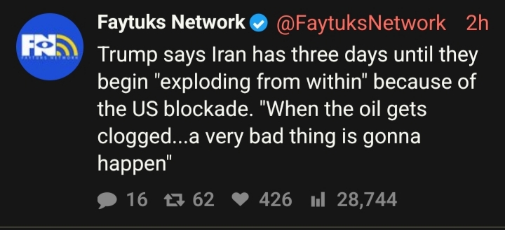 Previous: >>533907851Day: 18 of the 14-day Ceasefire™ with IranDay: 57 of the 1-day "Special Military Operation™ to decapitate Iran"Day: 9 of the 10-day Ceasefire™ with Lebanon▶RECENT:>Iran is prepared for the 'largest missile launch in history' at the occupied territories and some Arab countries allied with the US as soon as it sees signs of any strike.>Iran has prepared POW camps in the event of a ground invasion.>Iran has adopted a policy of non-negotiation until the US ceases their naval blockade.>POTUS "canceled" negotiations with Iran, "We have all the cards!...If they want to talk, all they have to do is call!!!">POTUS announced he ordered the U.S. Navy to "shoot and kill any boat... that is putting mines in the" Strait of Hormuz.>Senior Israeli official says preparations are underway for approval from the US administration to resume hostilities — Channel 13>The UK Maritime Trade Operations Center reported a security incident 83 miles southeast off Somalia.>Somalia announces a ban on all Israeli ships passing Bab Al-Mandab.▶WARNING:>Do not trust any "happenings" or posts without link/proof>Uкraine / Яussia discussions belong in uнg or cнug▶Oil:https://oilprice.com/oil-price-charts/▶Kino:https://rentry.org/pig-kino▶X Accounts:https://rentry.org/irxacc▶Live-streams:https://www.youtube.com/watch?v=4E-iFtUM2kk [Embed]https://www.youtube.com/watch?v=TdcrT5OcS9c [Embed]https://www.youtube.com/watch?v=53G-Oy4r6M4 [Embed]▶Telegram Channels:https://rentry.org/tgnews▶Israel Rocket Alerts:https://www.tzevaadom.co.il/en/▶Iranian Newshttps://farsnews.irhttps://www.tasnimnews.ir/https://www.presstv.ir/https://www.presstv.co.uk/▶Air Traffic:https://www.flightradar24.com/https://flightaware.com/livehttps://globe.adsbexchange.com/▶Maritime Traffic:https://www.marinetraffic.com/https://www.vesselfinder.com/https://hormuztracking.com/