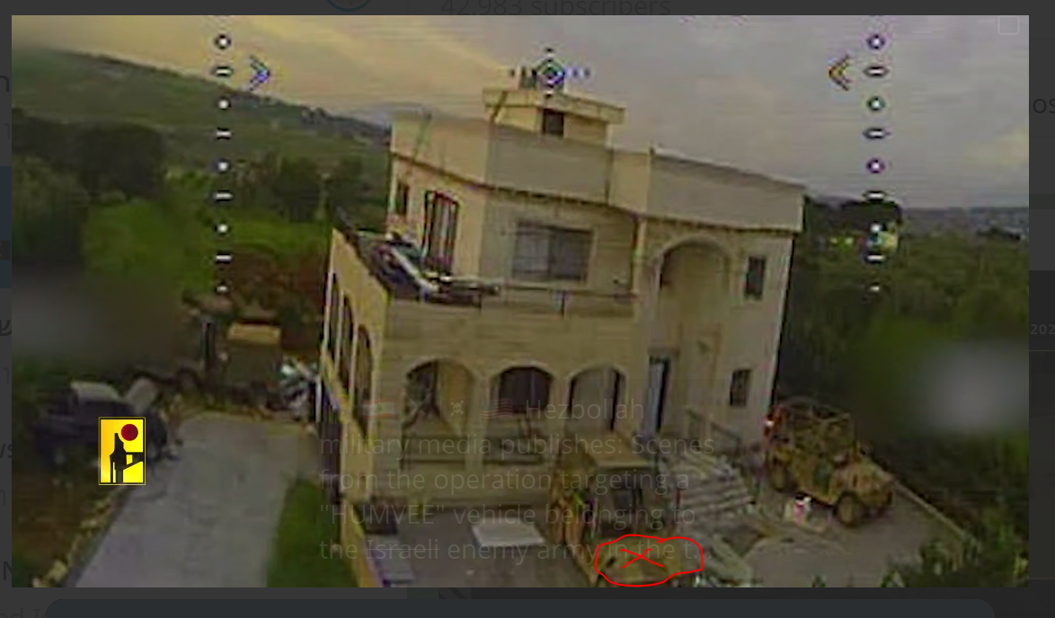 New Hezbollah video, they're pumping them out every 30 minutes today:From two days ago, April 24, IDF Humvee blasted right in the hood/engine, in Lebanon.But that mansion was full of soldiers I bet. Sort of a gated property isolated from other residences, like a manor.So the jews were probably right in there, not nearby.Anyway, I guess hitting the Humvee saved the house from destruction...