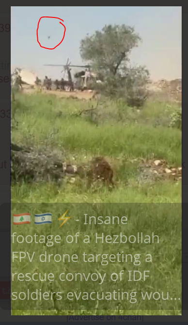 >Crazy footage from Lebanon: An explosive drone hits just a few meters from the rescue helicopter, after the incident in which Sergeant Idan Fox fell this morning - no casualties in the second explosion. The helicopter took off seconds after the explosion unharmed.How dafuq do you miss? imagine if they hit the copter, that's a mass causality event and prestigious Apache down