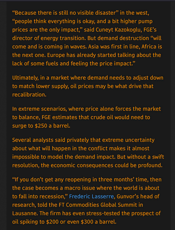 > “We’ve borrowed supply,” Russell Hardy, chief executive officer of Vitol Group, the largest independent trader, said at the FT Commodities Global Summit in Lausanne this week. “But you can’t do that forever. There are recessionary consequences from having to ration that demand.”this is I think optimistic, should round two happen the world will never be the samethis is bigger than 9/11 and trump did it for israel, with the democrats supporting the war as well, because they are jewish
