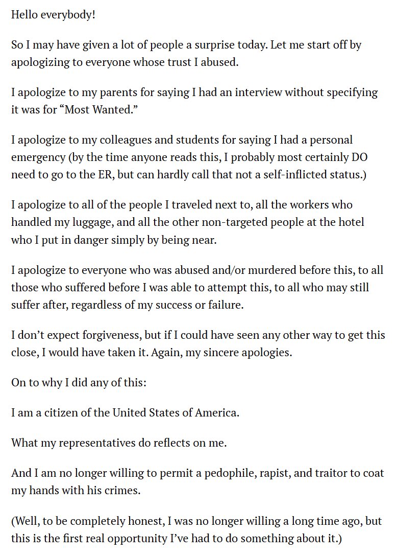 >>533920925He probably started bum rushing when the metal detector alarm went off.>>533921063This. It reads like an out of office work email.>Sorry I couldn't make it to the meeting but I'm out of office due to a personal emergencywtf is this shit? I was expecting 30 pages of schizo ramblings minimum.