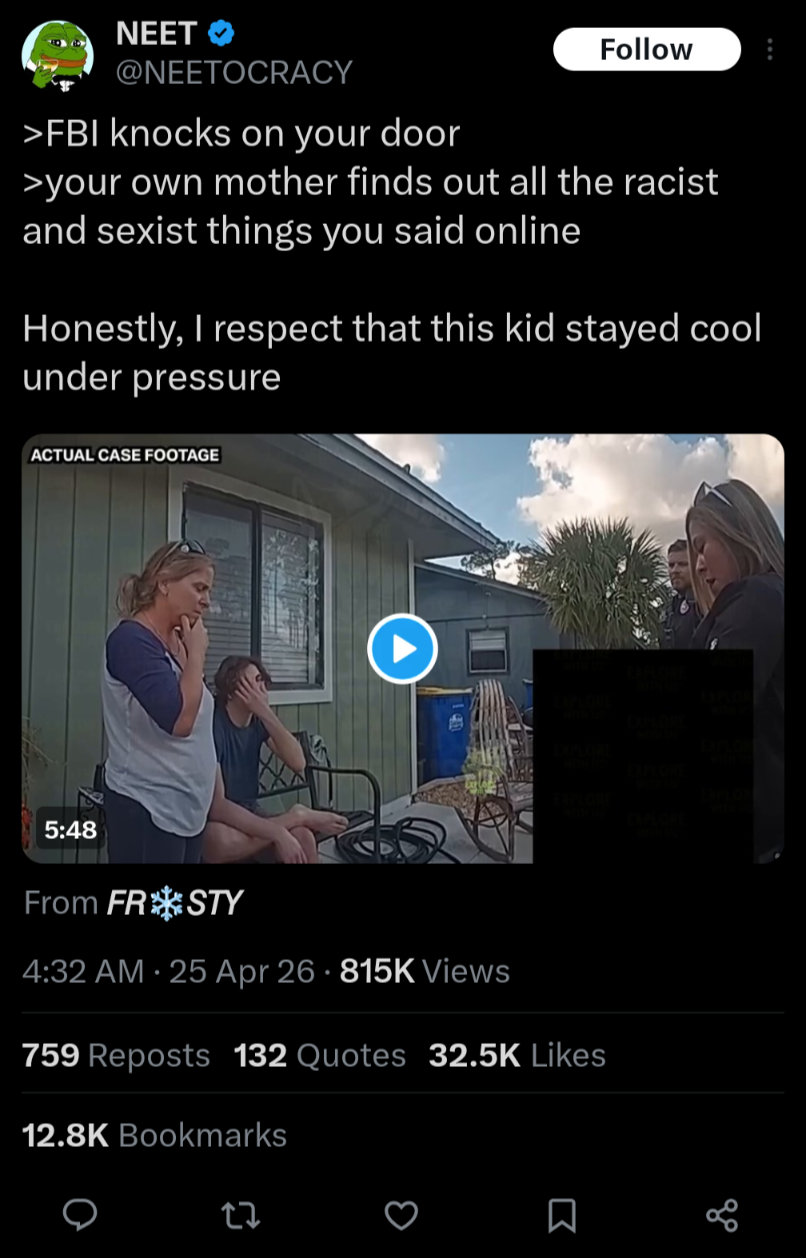 >>533924894If you're posting pictures on your personal Instagram of yourself posing with a gun and declaring your intent to kill any group of people (maybe except white people), you're gonna get a visit from law enforcement. It's amazing how many people don't understand why this happens.