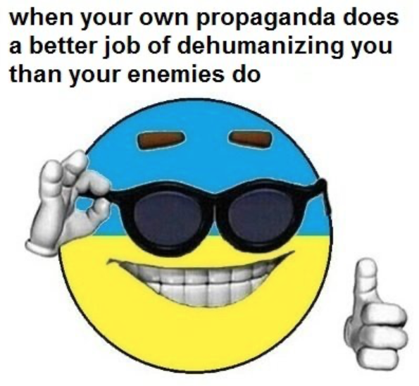 >>533937987>>533938134take your meds. this is one of the lousiest agitprop campaigns irl I've seen, even the atrocity porn in Syria was better. I mean, with friends like these..... you have to pick one and decide, is Ukraine le beacon of freedumb and democracy or le scawwy wannabe mujahideen ruzzslayers. you cannot do both without clowning on yourselves