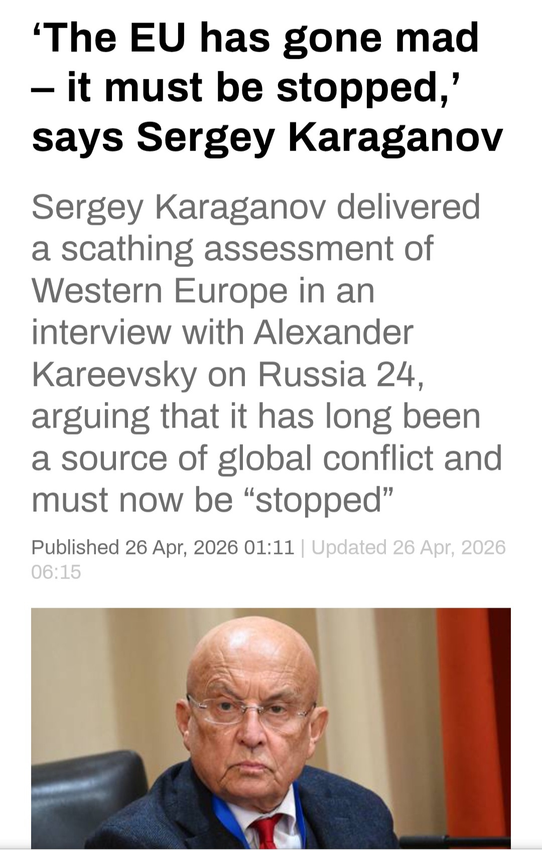 So an influential Russian political scientist has gone totally "General Ripper" advocating pre-emptive nuclear strikes on all of Europe because Ukraine doesn't want to be controlled by Moscow, and this is reported by RT as a completely rational position and what Putin should have done from the start. Does this not kind of vindicate Europe's "Russophobic" stance?