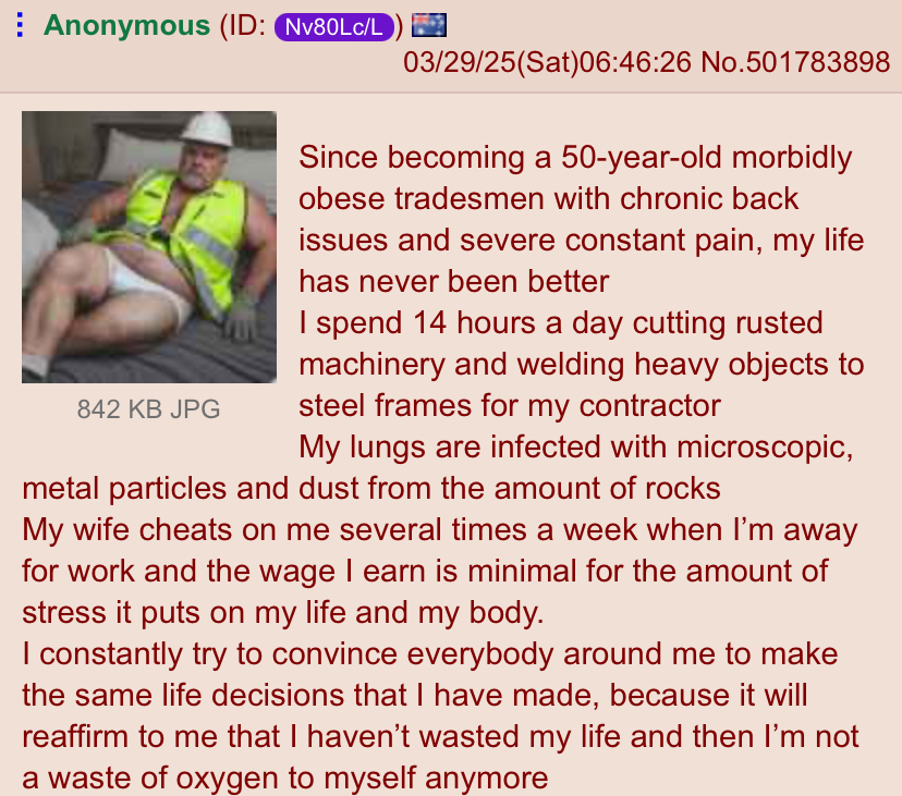 >>533927694Construction is absolutely back breaking and a slave tier job.>>533928254This is gay as fuck, and also disguising insults as jokes is not cool.