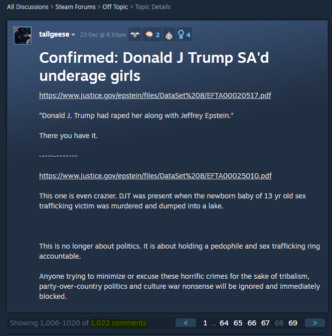 What we do know, proven in multiple court cases, is that Trump has committed civil sexual assault, is a serial adulterer, who paid porn stars for sex, and publically bragged about invading the dressing rooms of underage teen pageant contestants while they were changing, partially or fully nude (corroborated by interviews with girls); brags about “grabbing women by the pussy”; has admitted to a being good friends with Jeffery Epstein, travelling numerous times on his plane, sharing a close social circle connection, and even congratulating him with an obscene drawing on his birthday.
