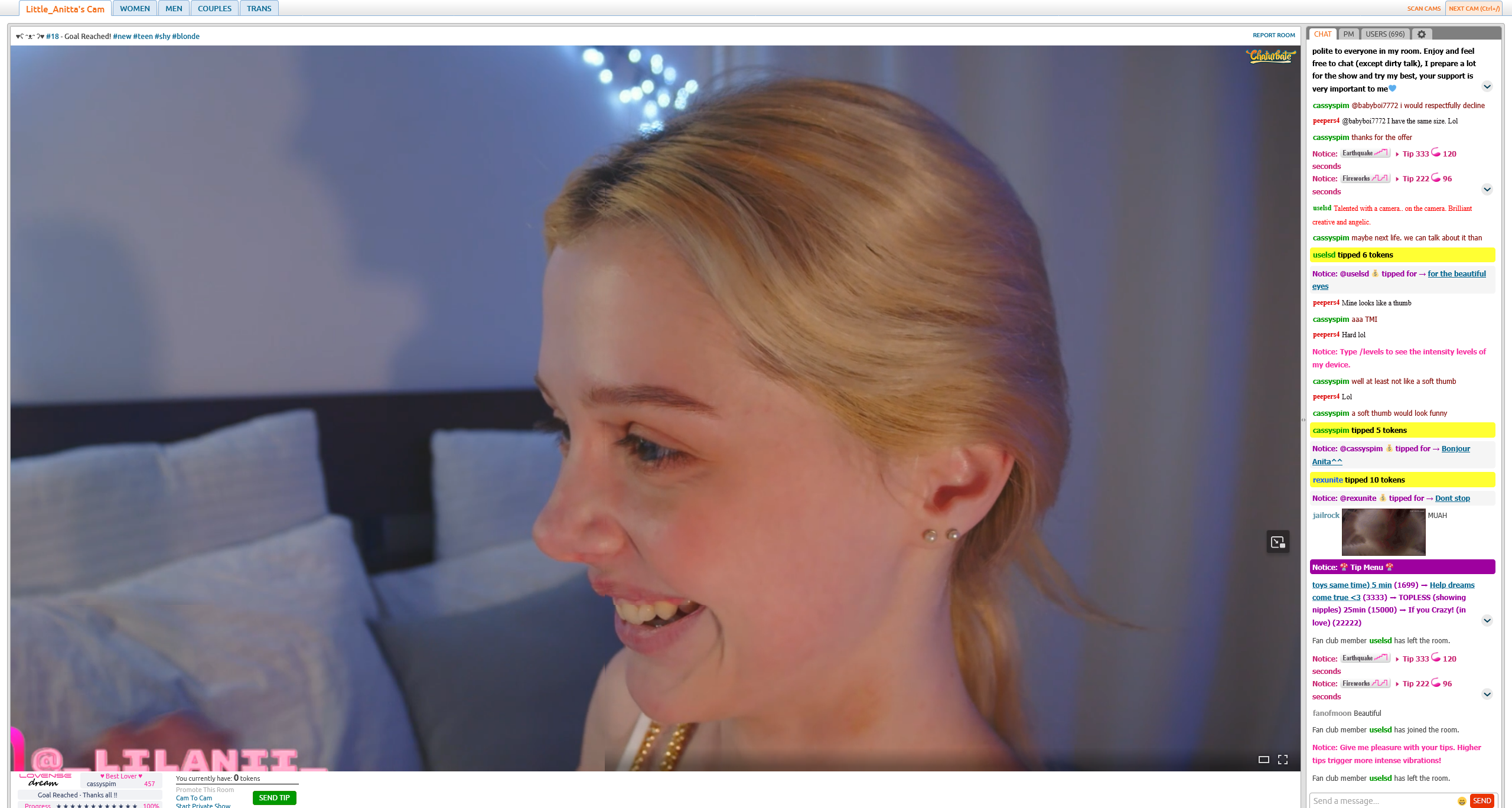 >i'm going to show my tits and there's a dildo that vibrates when you tip me, but no dirty talk in chat please, i'm a classy woman