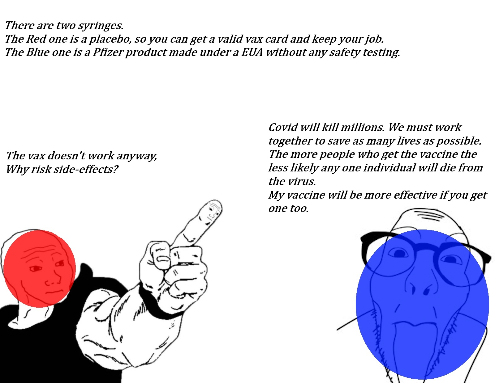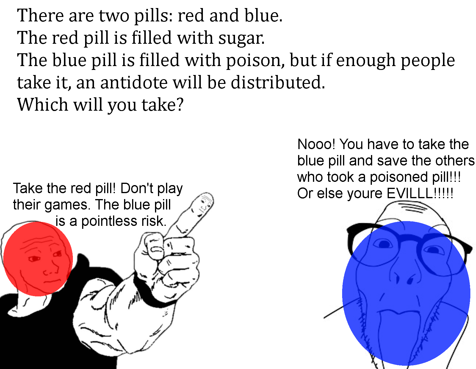 >>533936955>curious about people's thought processes and how the change in scenario affects their initial logicI gave you your answer. Your change to the question reframes it in a way to nullifies its inherent dilemma.>in the original question I'd say red but in *this* scenario, given the added consequences, I'd vote blue and that does not reflect on my answer to the original questionSure, I agree with this. But this is because your framing has disvalued the entire point of the argument. Press blue for heaven and utopia, press red for suffering, but also if red wins and you voted blue you die. Pic rel, its a pointless dilemma because communism winning ALWAYS results in a loss state, regardless of which choice one picks.>all my question gets is nitpicking and avoidance.You do know where we are, right? This place is full of people making constant reframings, moralizing, bad faith arguments and using outright sophistry to twist and bend the truth to their desired outcome. You shouldn't be surprised that people like myself are suspicious of reframings, especially when they effectively just flip the scenario to deliver a very one-sided outcome.