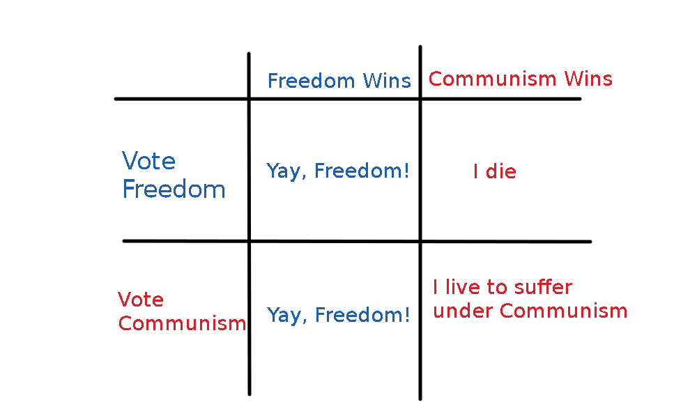 >>533940938It does if you don't hyper focus on the (admittedly poorly-chosen) details.Forget the Freedom-candidate/Communist-candidate part. Let's just call them Candidate A and Candidate B.Candidate A is running on the "everyone gets to live" platform. Candidate B is running on the "everyone who votes for Candidate A gets executed" platform. Lay aside what type of leader they might be otherwise once in office. Which one do you vote for?