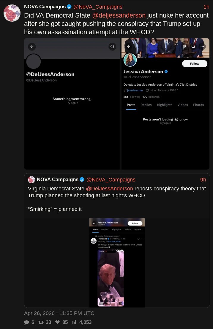 >Did VA Democrat State @deljessanderson just nuke her account after she got caught pushing the conspiracy that Trump set up his own assassination attempt at the WHCD?TDS claims another victim.