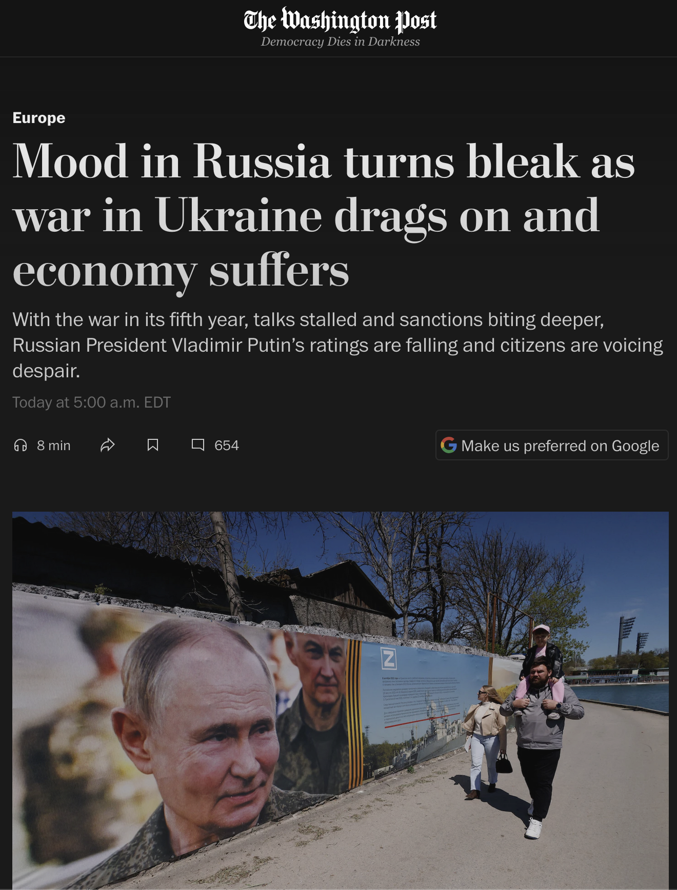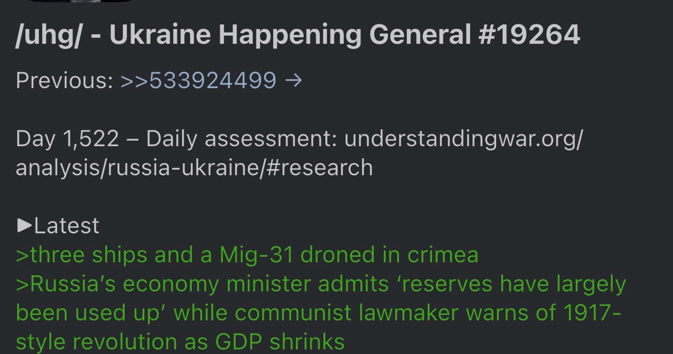>>533947462>if he were russian monkey he would trust TrumpAnon, I...Anyway, what's the point of bombing Europe if it were possible to just end the conflict outright on Russia's terms? That's putting the cart before the horse, imo.>>533947552If you think ukr_pics is bad, then you should check out r/worldnews every now and then for a laugh. According to them Russia is in shambles and on the verge of both economic and military collapse.I used to do a "round up" of the r/worldnews frontpage sneed every now and then, but stopped because it was getting so repetitive.>coping/chug/ kind of does this, but mostly in the form of not discussing Russia's setbacks (any country in war will experience them no matter how strong). But that's OK because no one has ever claimed /chug/ was neutral or objective.Link to the WaPo article if you want to see the goyslop delusions that normies get fed: https://www.washingtonpost.com/world/2026/04/26/russia-public-despair-war-ukraine/