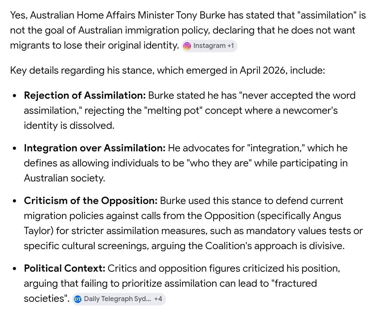 Labor need to be out of government as soon as possible. Tony Burke the immigration minister saying that assimilation isn't even the goal anymore is putrid. He wants to destroy Australian culture.