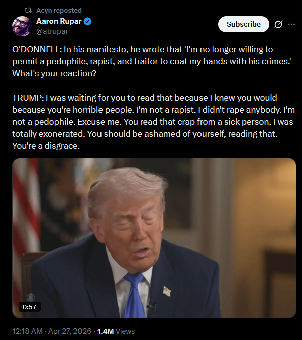 In his manifesto, he wrote that 'I'm no longer willing to permit a pedophile, rapist, and traitor to coat my hands with his crimes.' https://x.com/atrupar/status/2048542347869192532