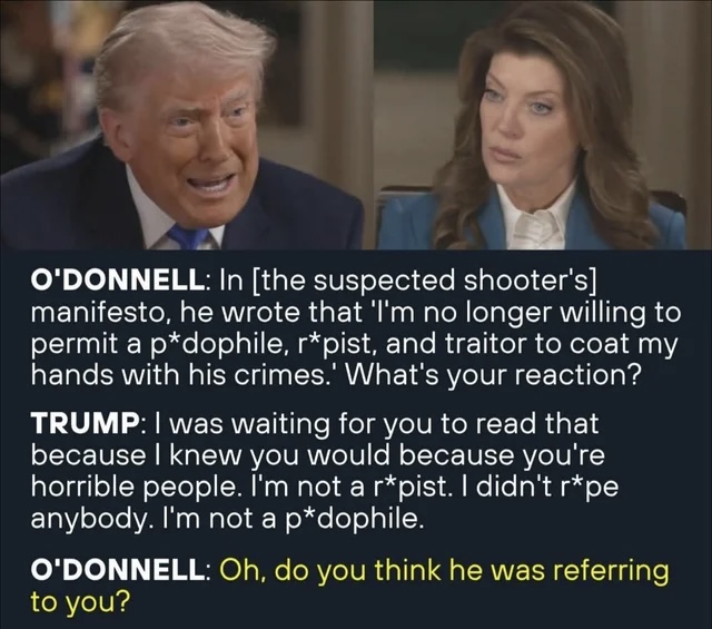 >>533955309truly disgustingthen she interrupted him & pulled the "Oh so you think he was referring to you?" basically calling him a rapist & a pedophile.We do not hate these people enough.