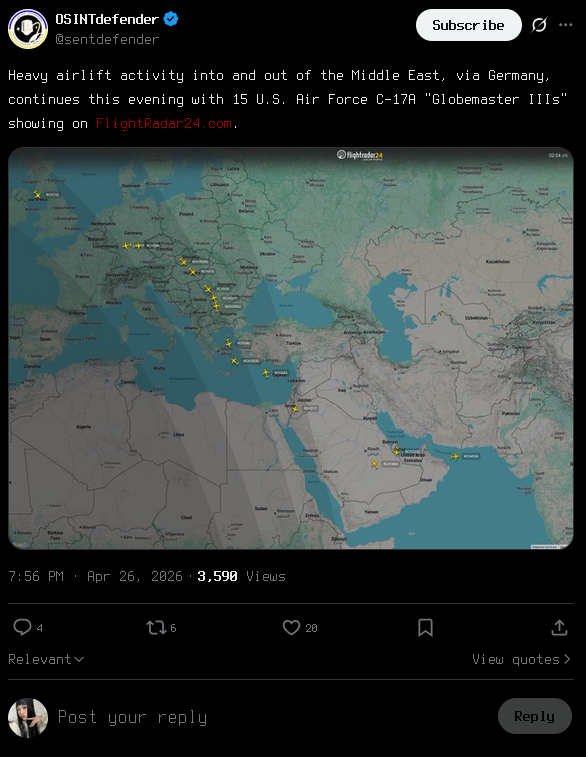 MASSIVE AIRLIFT ACTIVITY IN AND OUT OF THE MIDDLE EAST AMIDST THE WHITE HOUSE ASSASSINATION FIASCO AND IRAN SHUTTING DOWN ANY SORT OF DIPLOMACY WITH THE UNITED STATES.THE CEASEFIRE, AS STATED BY PRESIDENT TRUMP, CAN AND WILL BE ENDED BY HIS OWN TERMS WITH NO DEADLINE WHATSOEVER.WE ARE POSSIBLY GOING TO SEE A RESUMPTION OF THE IRAN WAR, WHICH IS A COMPLETE BLUNDER ON IRAN'S PART FOR LETTING THE UNITED STATES ACTUALLY FULLY COMMIT TO A LONG WAR WITH THE IRANIAN REGIME.THE UNITED STATES HAS TESTED IRAN'S FIREPOWER AND HAS ADJUSTED THEIR STRATEGIES ACCORDINGLY TO BRING ABOUT A COMPLETE DESTRUCTION OF IRAN AND ALL OF ITS PROXIES.WHY IRAN ALLOWED THE UNITED STATES TO DO THIS UNDER THE GUISE OF DIPLOMACY WOULD BE A QUESTION FUTURE HISTORIANS WILL CONTINUE TO STRUGGLE WITH.