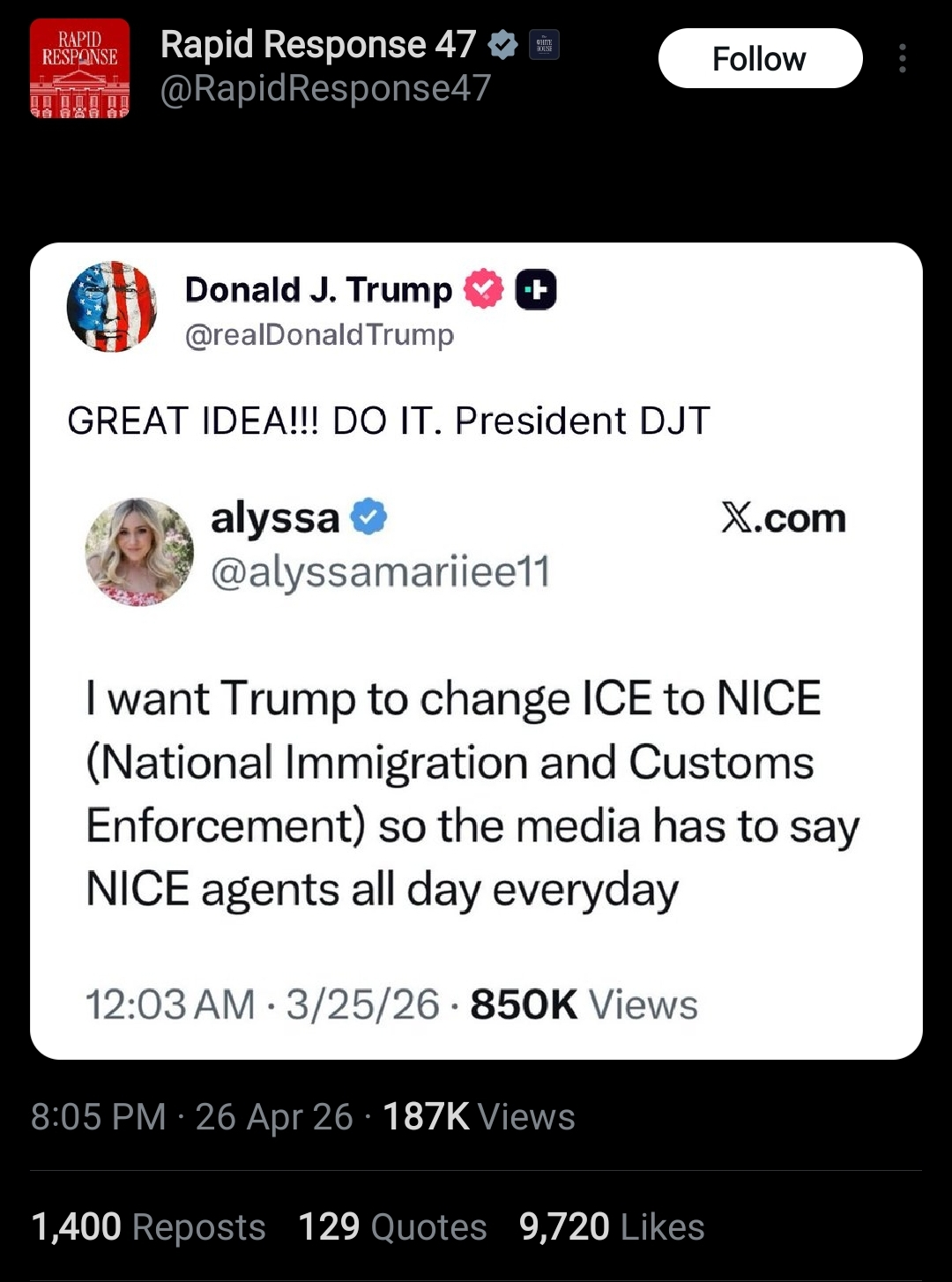>>533954171>NICEThat's one of the few things I'll give this president credit for if he actually does it. And silly bitch Alyssa, she deserves most of the credit. Actual smooth move, Rico Suave.