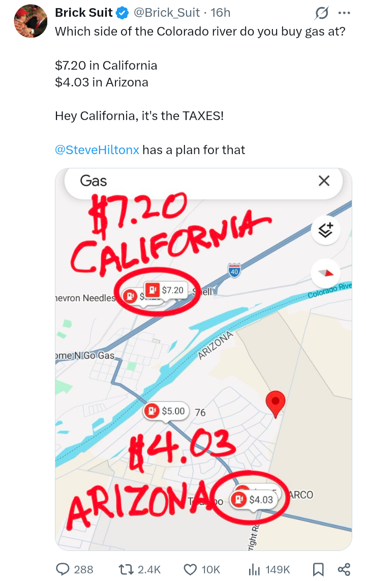 >>533955450Demofuckwits also can't understand the concept that the average price of gas is not the same as the price in their gay blue California shithole city.