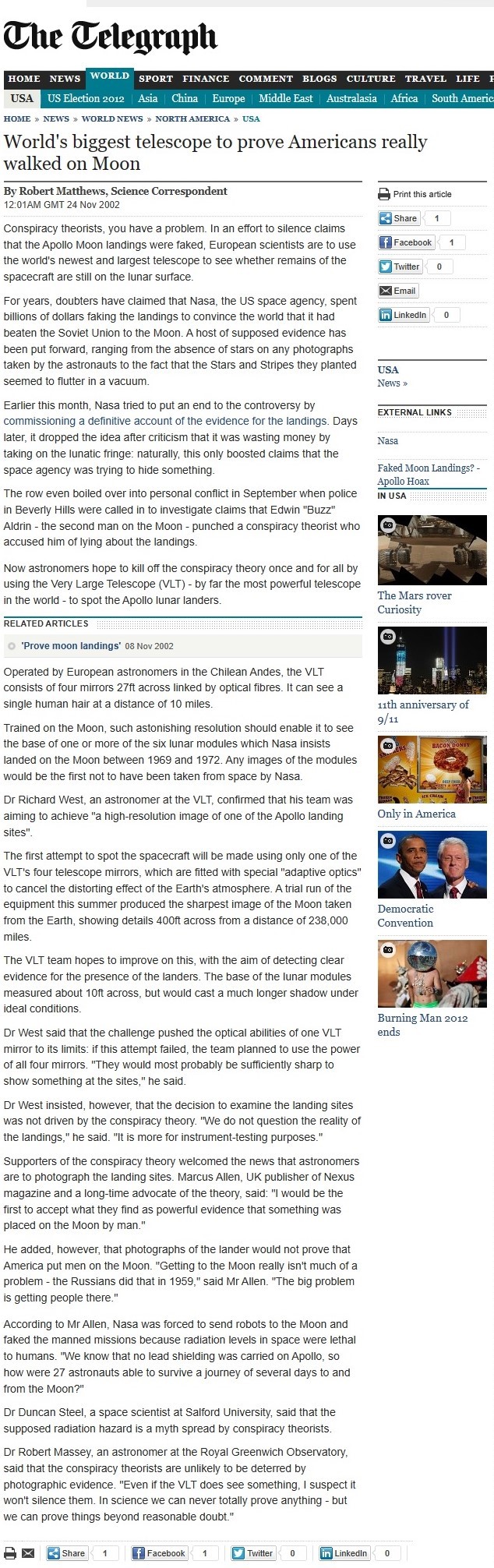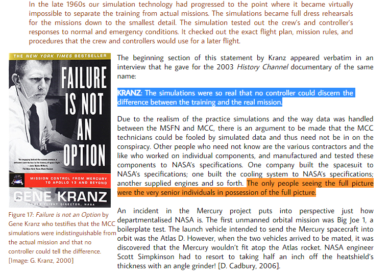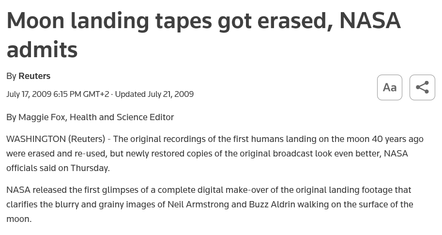 >>533973716>>533973771>>533973862This argument mixes a few real facts with misleading conclusions.First, the “we couldn’t broadcast from deserts decades later” claim is false. Live TV from the Moon in 1969 used a simple, low-bandwidth analog signal relayed through large ground stations. It wasn’t comparable to portable war-zone broadcasting, which had different constraints (mobility, infrastructure, security). Apollo’s system was purpose-built and worked as expected.Second, NASA did not “lose all footage.” What’s missing are the original SSTV tapes of Apollo 11, which were reused in the 1970s due to standard data-tape recycling practices. However, multiple high-quality recordings, copies, and broadcasts still exist, sourced from tracking stations worldwide. The event was independently received and recorded by observatories in several countries, not just NASA.Third, telemetry and mission data are not “gone.” Vast amounts of Apollo data, including telemetry, voice transcripts, engineering reports, and tracking information, are archived and publicly available. The missions were also tracked independently by the Soviet Union during the Cold War, which had every incentive to expose a hoax but never did.Fourth, “missing blueprints” is misleading. Some original manufacturing documents were lost or dispersed over decades, which is common for large 1960s programs involving many contractors. But the designs, specifications, and engineering knowledge are extensively documented. We know exactly how Saturn V and the lunar modules worked..