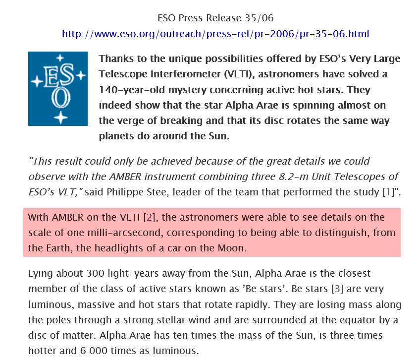 >>533960208in the interferometer setup it has an angular resoution of 1 milliarc second which is enough to distinguish headlights of a car parked on the moon. they said so themselves>>533959438