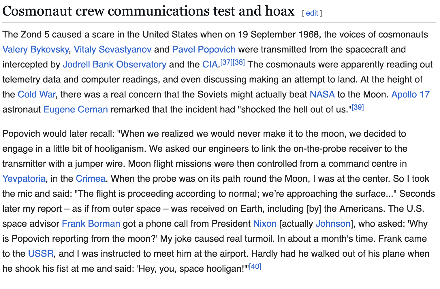 >>533970470thats for sure. the best they have is stuff from the old 1950s satellites that first detected the VAB radiation. they think that because the sensors were calibrated for low levels and consequently had readings off the scale that its instant death to go anywhere near them.its all the same stuff over and over again from these people. >>533970512>perhaps they faked the first landing but consequent ones were genuine, its was about beating the russians & being the firstwhy bother? apollo 12 was not long after 11 and russia had basically no manned flights for years leading up to it. they stayed with automated launches after they started losing crews.
