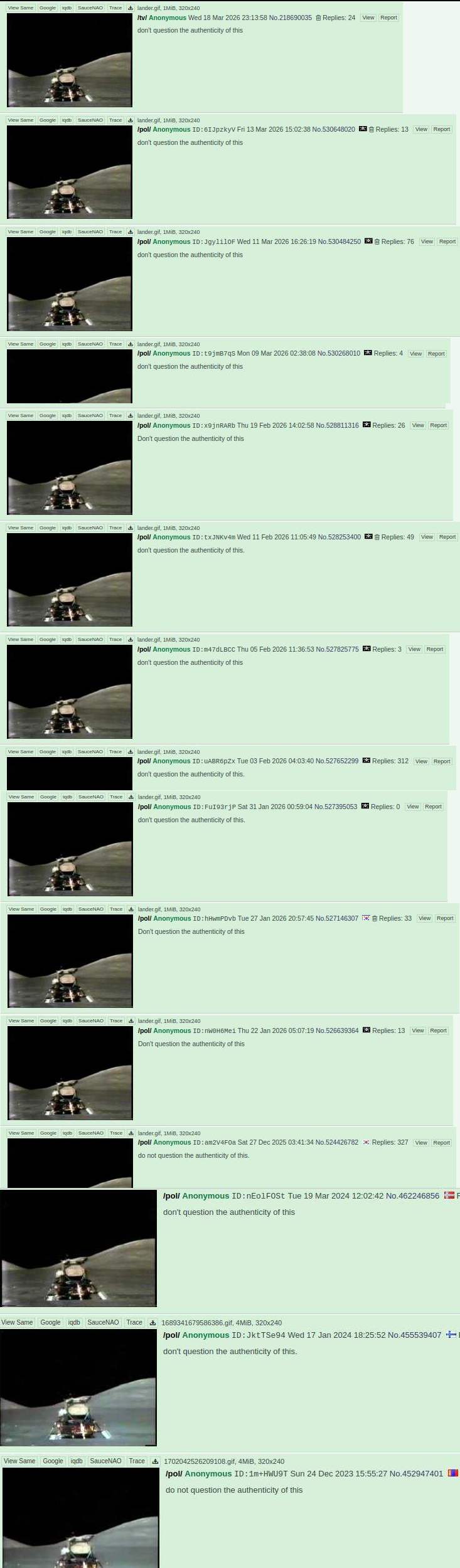 >>533971837>>533972188if you can't even imagine compelling evidence that means there is no evidence you would find compelling. the 16000 pictures, the dozens of hours of video, the hundreds of pounds of samples, the giant fucking moon sized rockets that lifted off in front of everyone. none of thats good enough for you, well, thats the only possible evidence. pictures, videos, witnesses, samples, what more could you even imagine? we have all the evidence. and then combined with the fact that every "proof" it didn't happen can be debunked with a few minutes of looking into it proves this evidence is airtight. what compelling reason do you have to believe its not possible for man to have been on the moon?