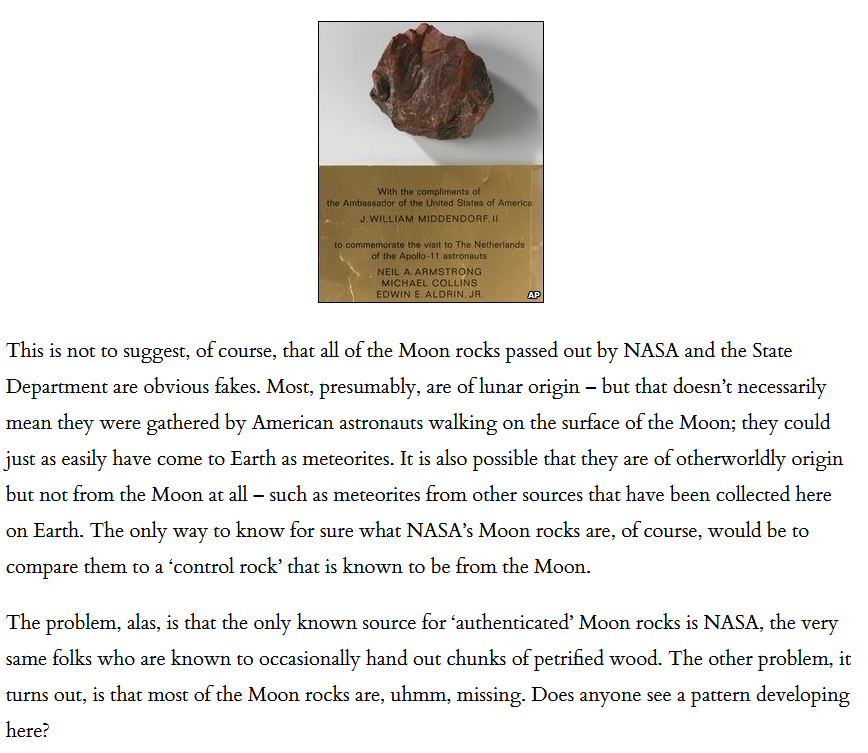 >>533960389>moon rockanswered by Wagging Moon Doggy Part 2 here is a portion--The problem, alas, is that the only known source for ‘authenticated’ Moon rocks is NASA, the very same folks who are known to occasionally hand out chunks of petrified wood. The other problem, it turns out, is that most of the Moon rocks are, uhmm, missing. Does anyone see a pattern developing here?Since the discovery of the fake Moon rock in the Dutch museum, ‘debunkers’ have claimed that the fact that no other Moon rocks have been declared fake proves that the Dutch case is an isolated one. “After that announcement,” goes the argument, “wouldn’t every other country in possession of a Moon rock have rushed to have them authenticated? And since no other country has made a similar announcement, doesn’t that prove that the Moon rocks are real?”At first glance, that would appear to be a valid argument. The problem, however, is that the vast majority of those countries can’t test their ‘Moon rocks’ because, shockingly enough, no one knows where they are! As the Associated Pressreported on September 13, 2009, “Nearly 270 rocks scooped up by U.S. astronauts were given to foreign countries by the Nixon administration … Of 135 rocks from the Apollo 17 mission given away to nations or their leaders, only about 25 have been located by CollectSpace.com, a Web site for space history buffs that has long attempted to compile a list … The outlook for tracking the estimated 134 Apollo 11 rocks is even bleaker. The locations of fewer than a dozen are known.”It appears then that having a ‘control rock’ wouldn’t really be of much help after all, since nearly 90% of the alleged Moon rocks that we would want to test don’t seem to be around any more.