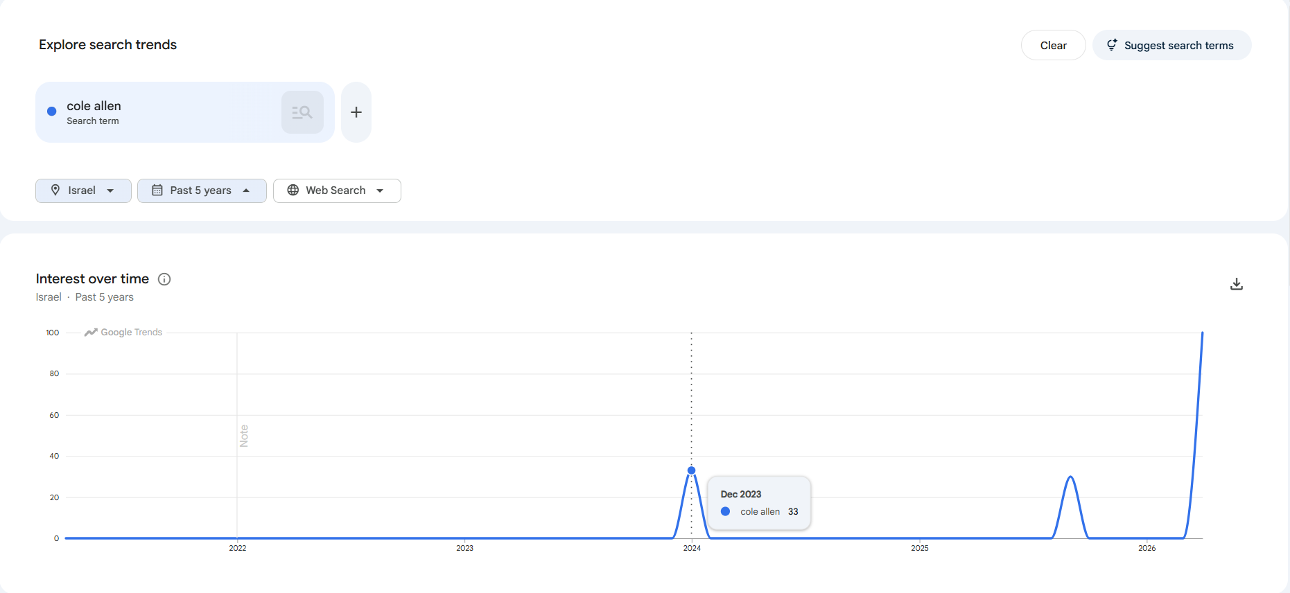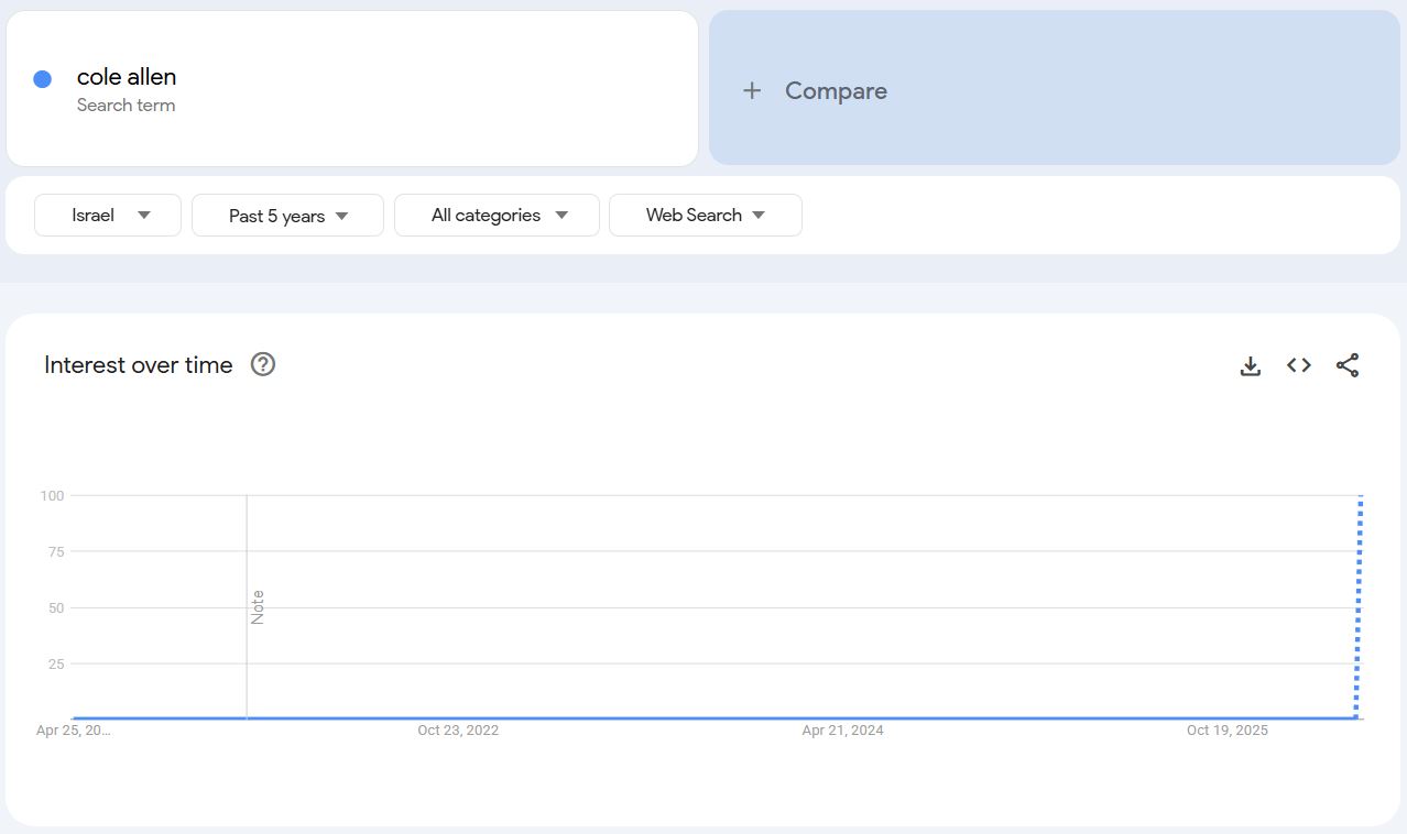 A Twitter account was created in December 2023 and made only one post saying "Cole Allen" with no context provided. Also in December 2023, Google search trends revealed that "Cole Allen" was searched up based on the location from Israel. What's going on?Twitter account: https://x.com/HenryMa79561893