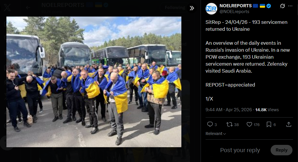 SitRep - 24/04/26 - 193 servicemen returned to UkraineAn overview of the daily events in Russia's invasion of Ukraine. In a new POW exchange, 193 Ukrainian servicemen were returned. Zelensky visited Saudi Arabia.https://x.com/NOELreports/status/2047959958768029952?s=20