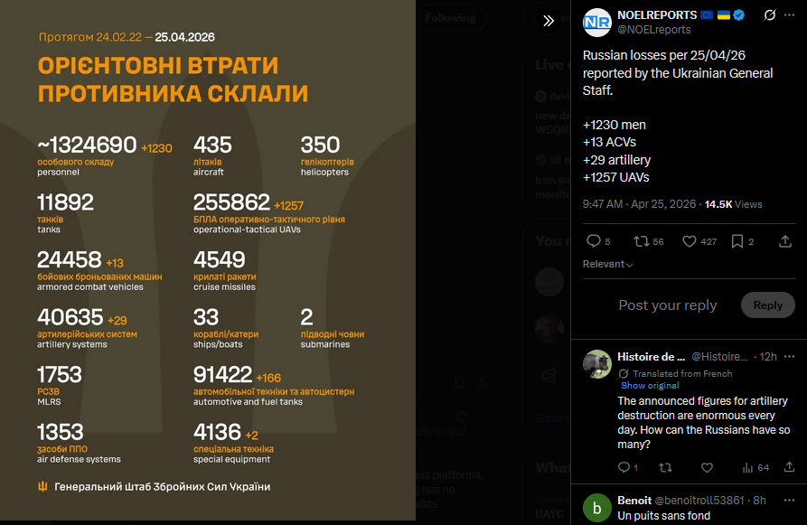 Russian losses per 25/04/26 reported by the Ukrainian General Staff.+1230 men+13 ACVs+29 artillery+1257 UAVshttps://x.com/NOELreports/status/2047960654204563761?s=20