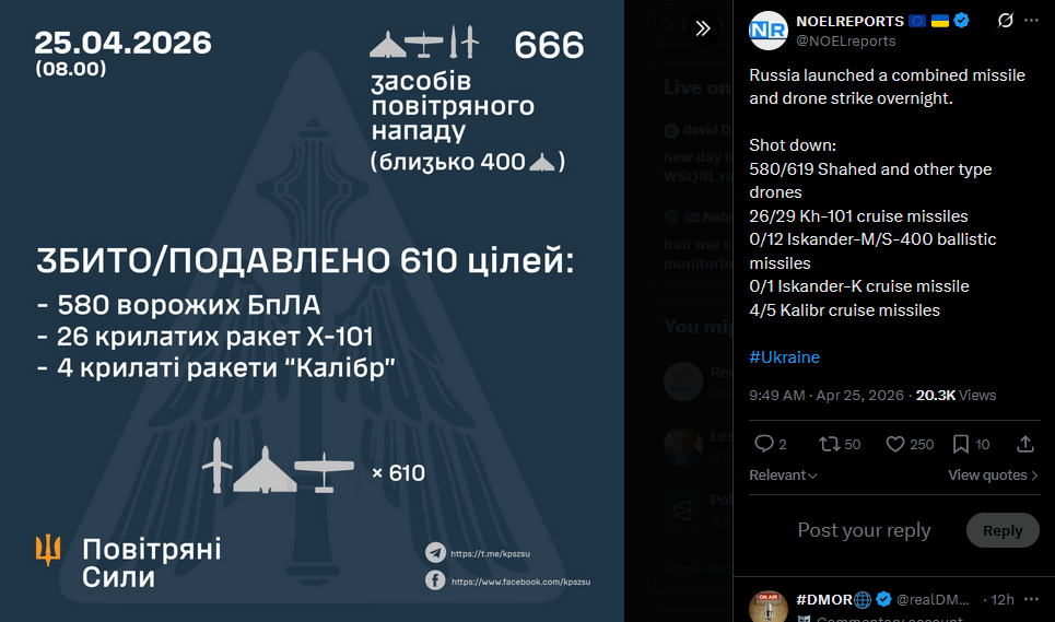 Russia launched a combined missile and drone strike overnight.Shot down:580/619 Shahed and other type drones26/29 Kh-101 cruise missiles0/12 Iskander-M/S-400 ballistic missiles0/1 Iskander-K cruise missile4/5 Kalibr cruise missiles#Ukrainehttps://x.com/NOELreports/status/2047961291323592781?s=20>25th