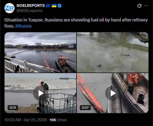Italy’s PM Giorgia Meloni opposed inviting Putin to the G20 summit in Miami, stating that Russia has not matched recent Western concessions. She said it is time to demand reciprocal steps from Moscow. #Italyhttps://x.com/NOELreports/status/2047961548879000054?s=20>25thSituation in Tuapse. Russians are shoveling fuel oil by hand after refinery fires. #Russiahttps://x.com/NOELreports/status/2047964379501523047?s=20>25thpic 1https://streamable.com/6yrv2tpic 2https://streamable.com/bu4ncgvideo 1https://streamable.com/zrwvixvideo 2https://streamable.com/74kcma