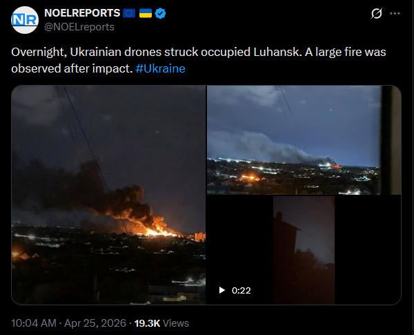 Overnight, Ukrainian drones struck occupied Luhansk. A large fire was observed after impact. #Ukrainehttps://x.com/NOELreports/status/2047964885686898896?s=20>25thpic 1https://streamable.com/9ggundpic 2https://streamable.com/ag67eevideohttps://streamable.com/bqwjwm