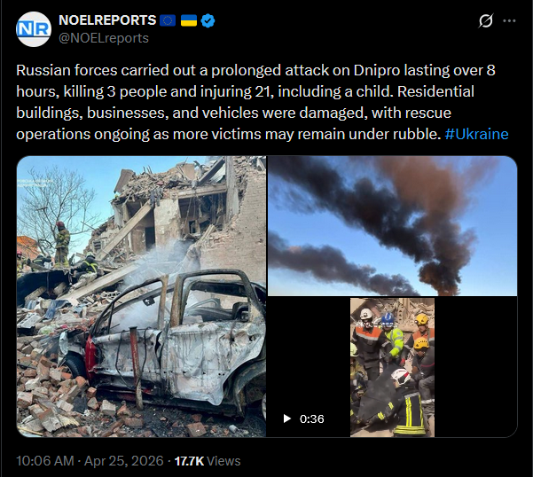 Russian forces carried out a prolonged attack on Dnipro lasting over 8 hours, killing 3 people and injuring 21, including a child. Residential buildings, businesses, and vehicles were damaged, with rescue operations ongoing as more victims may remain under rubble. #Ukrainehttps://x.com/NOELreports/status/2047965392660779172?s=20>25th