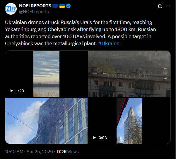 Ukrainian drones struck Russia’s Urals for the first time, reaching Yekaterinburg and Chelyabinsk after flying up to 1800 km. Russian authorities reported over 100 UAVs involved. A possible target in Chelyabinsk was the metallurgical plant. #Ukrainehttps://x.com/NOELreports/status/2047966380767523153?s=20>25thvideo 1https://streamable.com/t946s6video 2https://streamable.com/v6ehktpic 1https://streamable.com/3s2shwpic 2https://streamable.com/zk6nsv