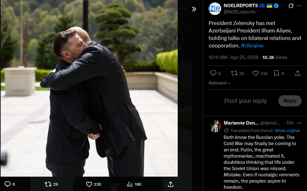 President Zelensky has met Azerbaijani President Ilham Aliyev, holding talks on bilateral relations and cooperation. #Ukrainehttps://x.com/NOELreports/status/2047966684552519832?s=20>25th