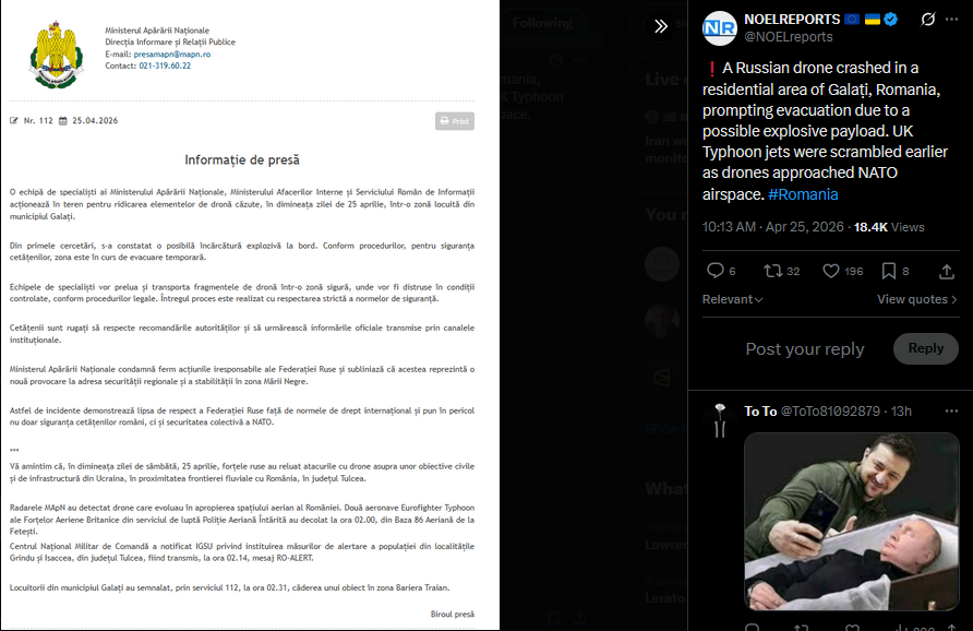 A Russian drone crashed in a residential area of Galați, Romania, prompting evacuation due to a possible explosive payload. UK Typhoon jets were scrambled earlier as drones approached NATO airspace. #Romaniahttps://x.com/NOELreports/status/2047967142289482231?s=20>25thUS Treasury confirmed it will not renew waivers allowing sales of Russian and Iranian oil already at sea. The exemptions were introduced during recent energy disruptions and are now set to expire. #USAhttps://x.com/NOELreports/status/2047967587582005336?s=20>25th