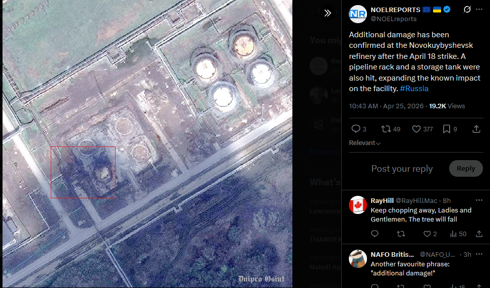 Additional damage has been confirmed at the Novokuybyshevsk refinery after the April 18 strike. A pipeline rack and a storage tank were also hit, expanding the known impact on the facility. #Russiahttps://x.com/NOELreports/status/2047974729156362283?s=20>25th