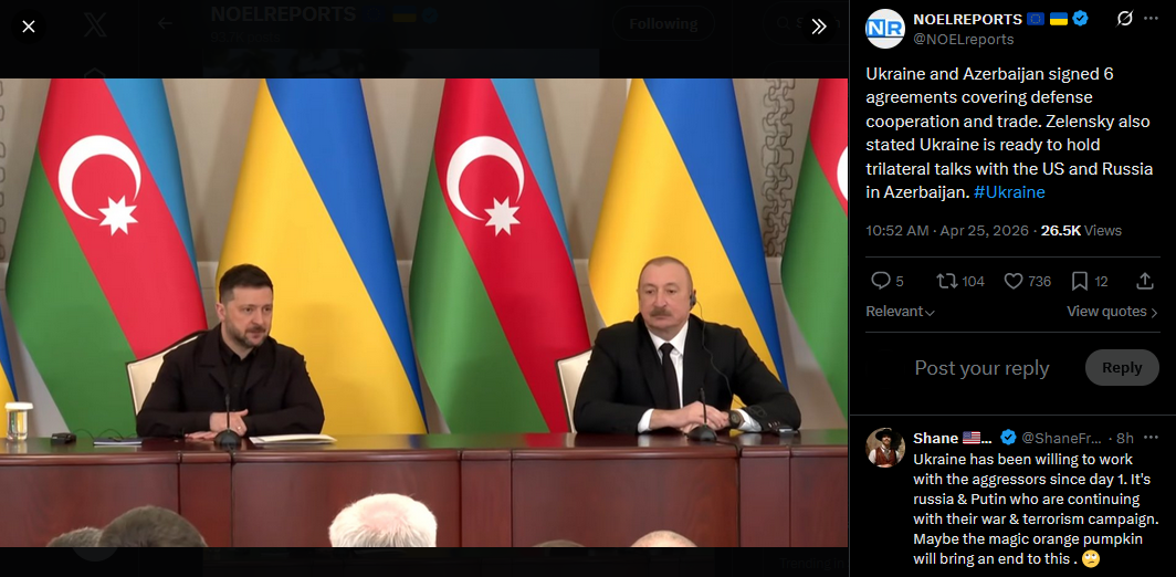 Ukraine and Azerbaijan signed 6 agreements covering defense cooperation and trade. Zelensky also stated Ukraine is ready to hold trilateral talks with the US and Russia in Azerbaijan. #Ukrainehttps://x.com/NOELreports/status/2047977121390207221?s=20>25th